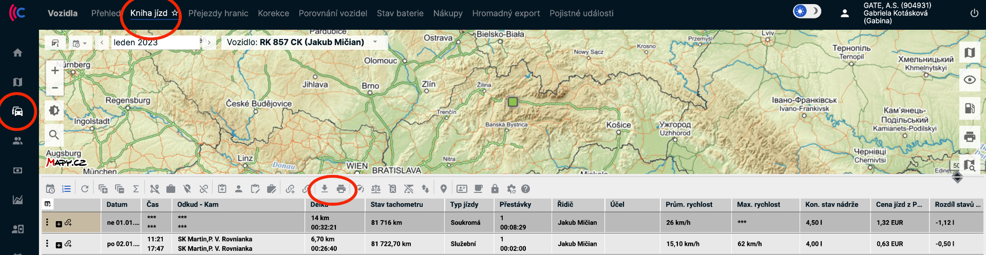 Přehledy jízd jsou i nadále snadné. Označíte si své auto kliknutím a z možností horní lišty si vyberete "kniha jízd" a níže, si přes symbol stáhnutí nebo tiskárny vytvoříte soubor jízd za uplynulý měsíc.