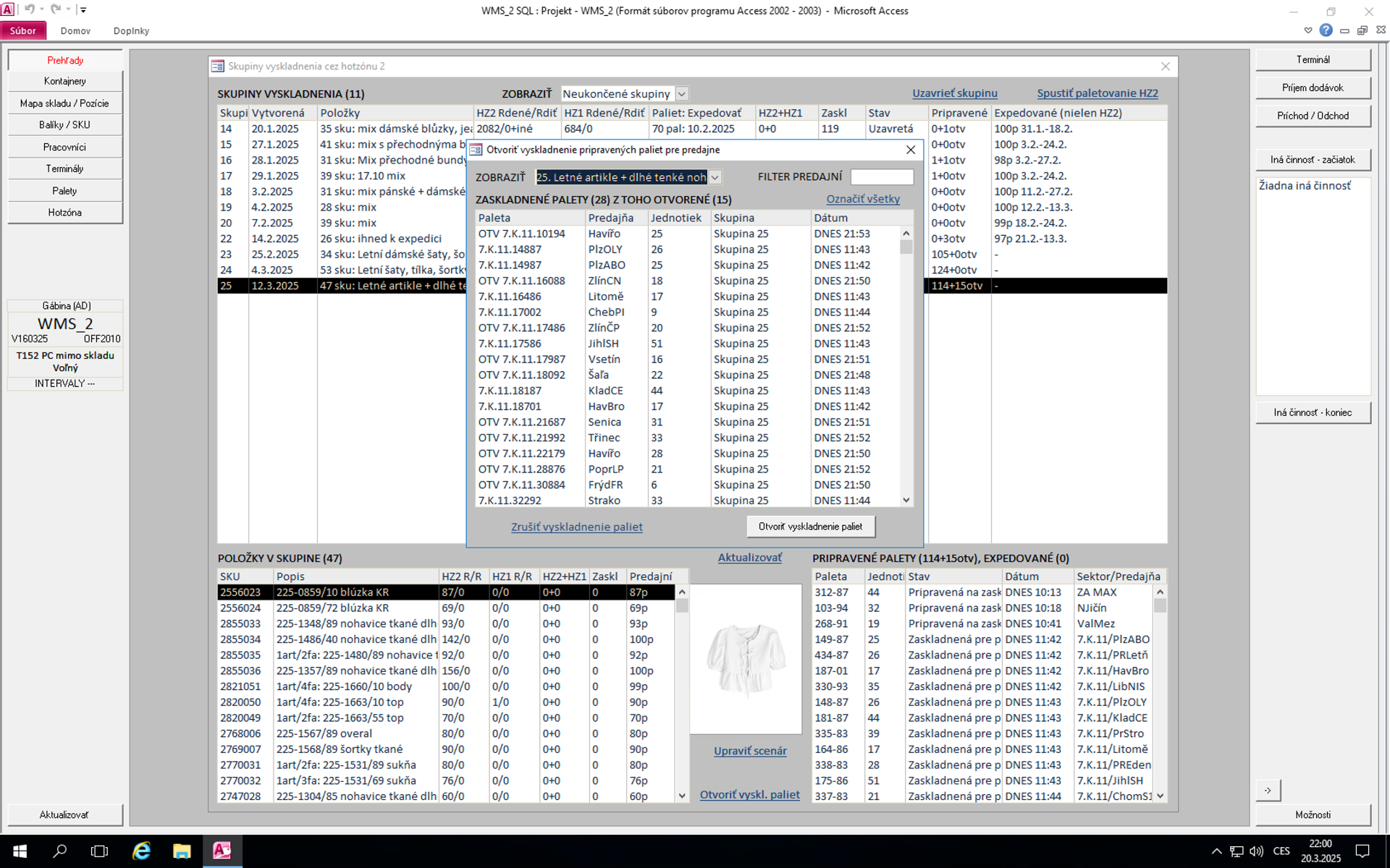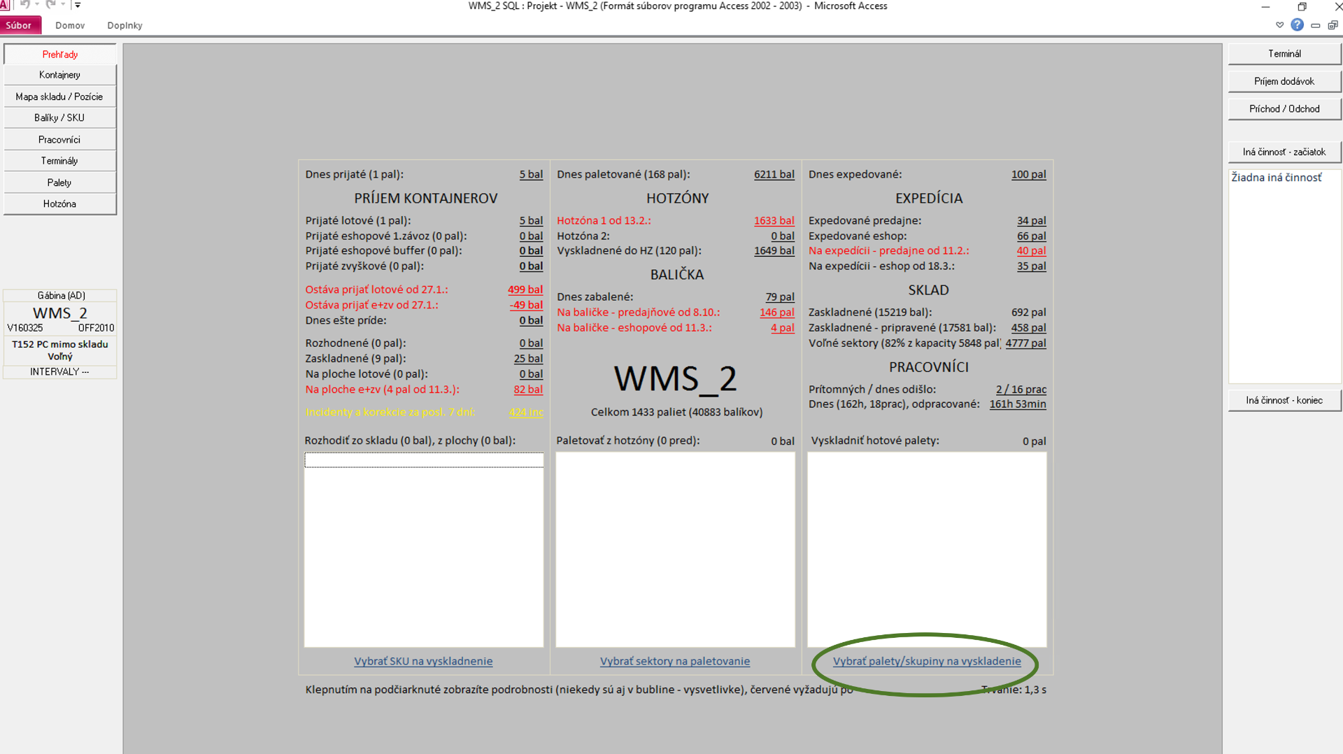 Po vypaletování a zabalení palet se připravené palety zaskladní na pozice skladu. Pokud palety nejsou zaskladněné na pozicích, nedají se pustit k expedici. Pro expedici palet skupiny se palety otevřou přes "otvoriť vyskl.palet". Po výběru konkrétní skupiny z filtru je možné otevřít jen konkrétní palety nebo jednoduše označit všechny palety skupiny. Stav palety v systému se změní na "pripravená na expedíciu" a pracovníci skladu ji mohou expedovat.