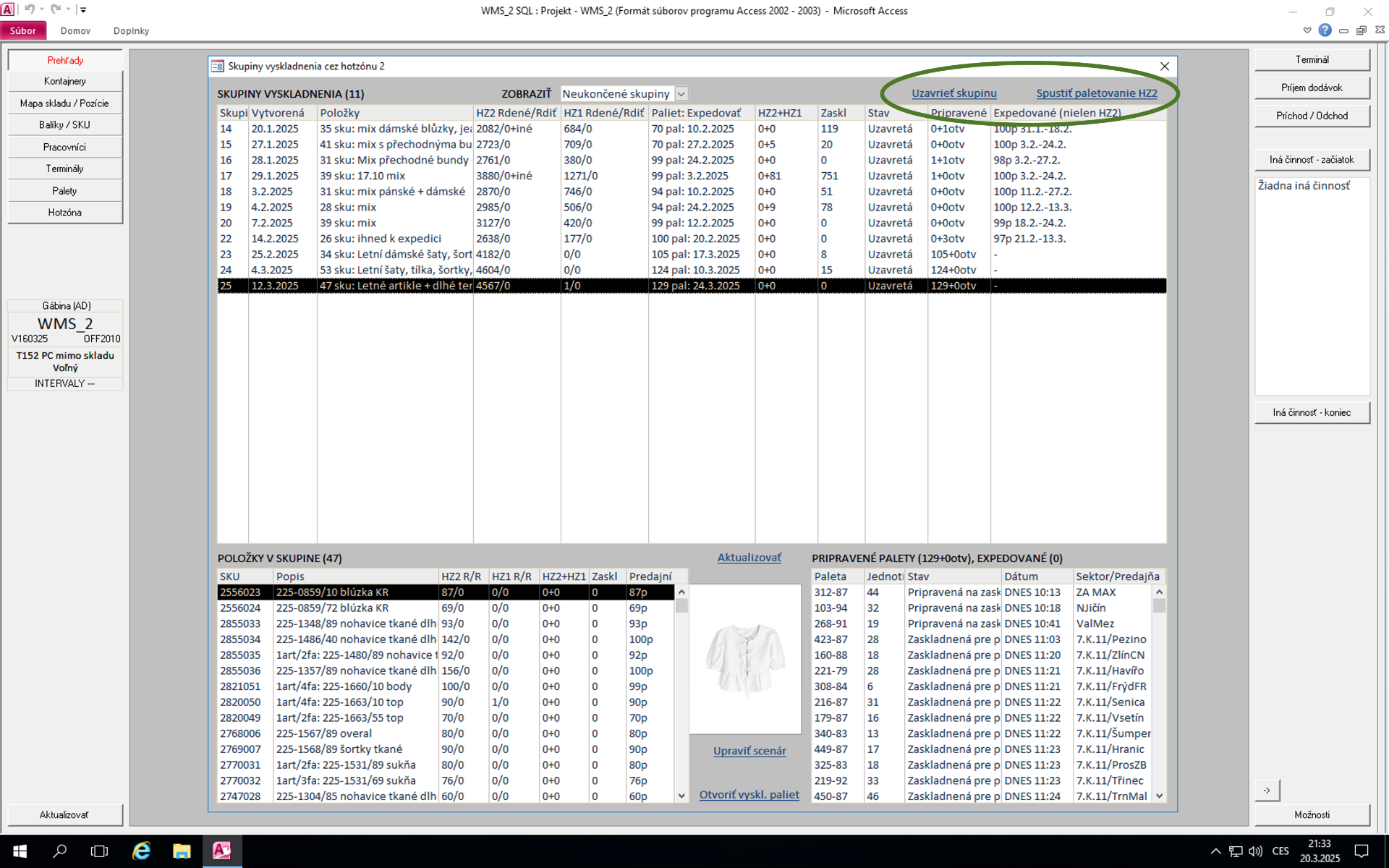 Přes "vybrat palety/skupiny na vyskladnenie" a "vyskladnenie skupiny HZ2". se skupina označí, uzavře přes "uzavriet skupinu". Po aktualizaci se skupina dostane do stavu "uzavretá" a přes "spustit paletovanie HZ2" se můžou začít sektory paletovat.