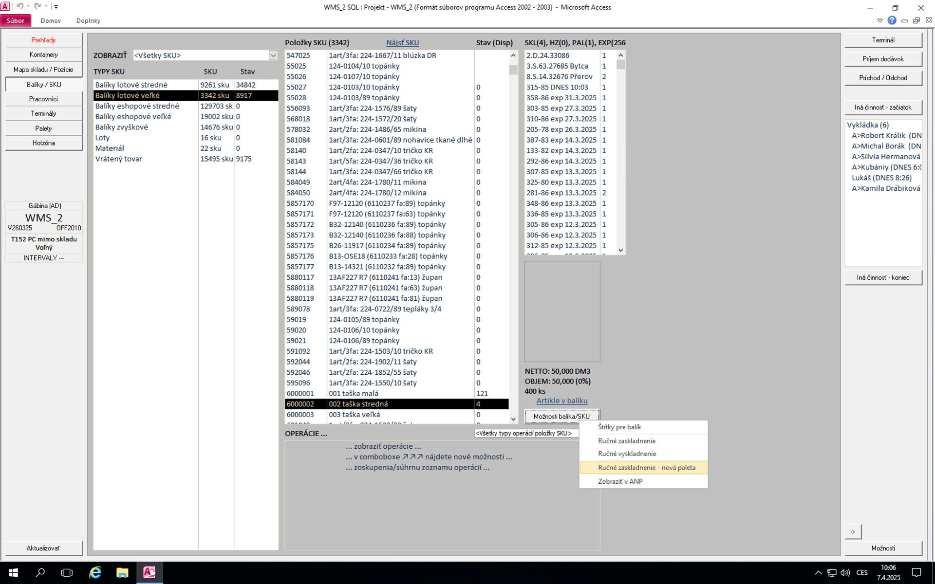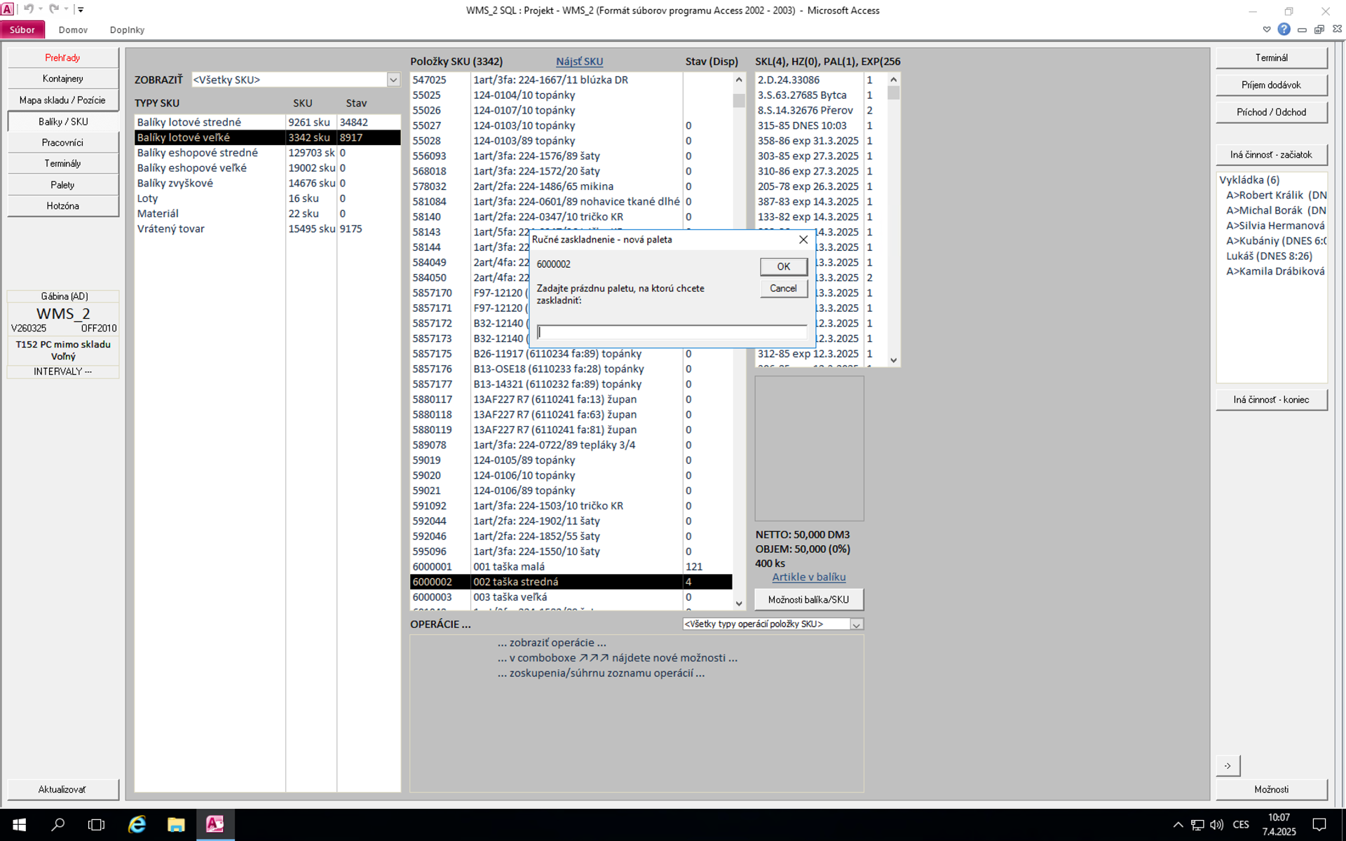 Ve WMS2 přes Balíky/SKU => "nájsť SKU" vyhledáme konkrétní SKU. Přes "možnosti balíka /SKU" zvolíme "ručné zaskladnenie - nová paleta" a doplníme informace do systému - číslo palety, pozici na kterou se paleta zaskladní, počet balíků a důvod zaskladnění - číslo faktury nebo dodacího listu a název dodavatele.