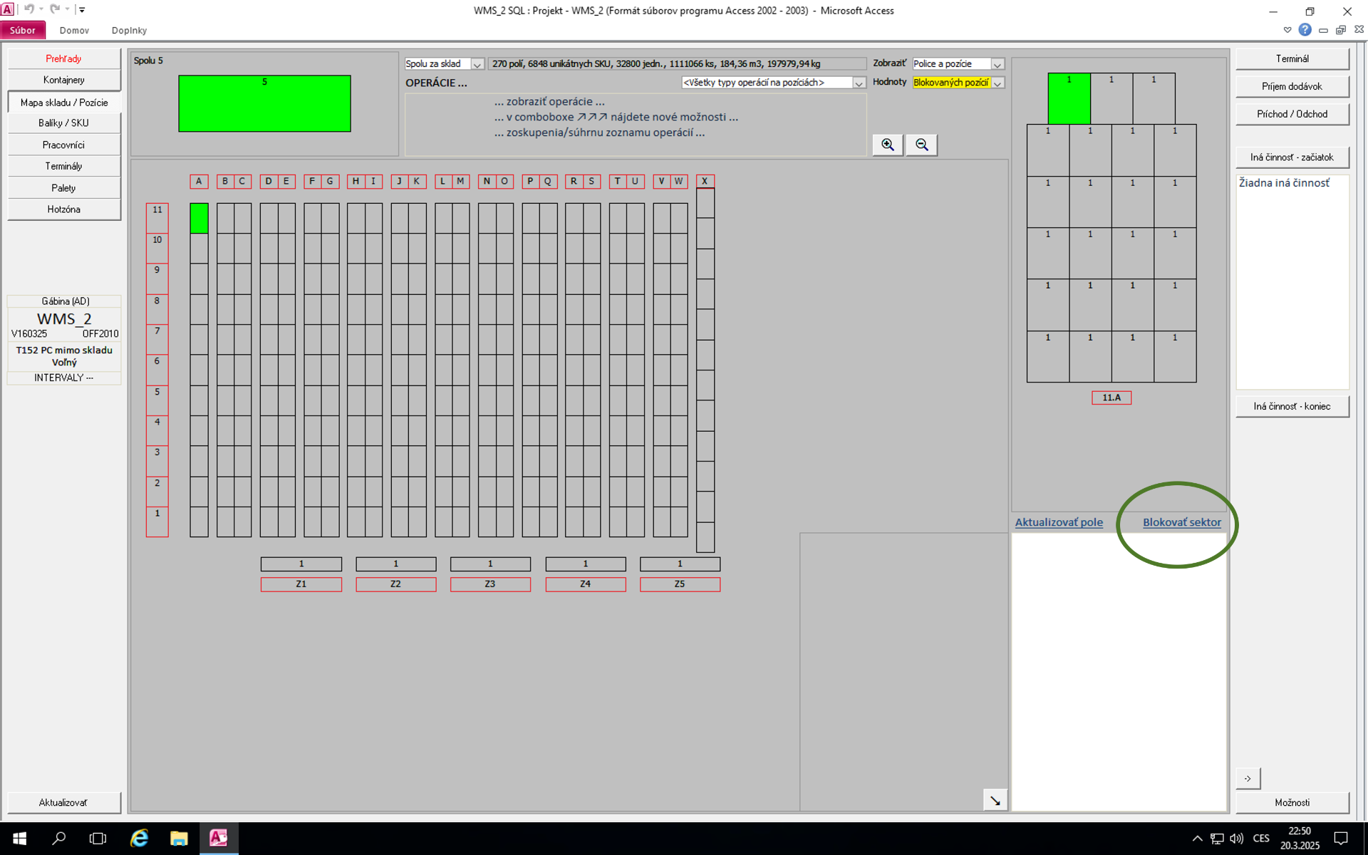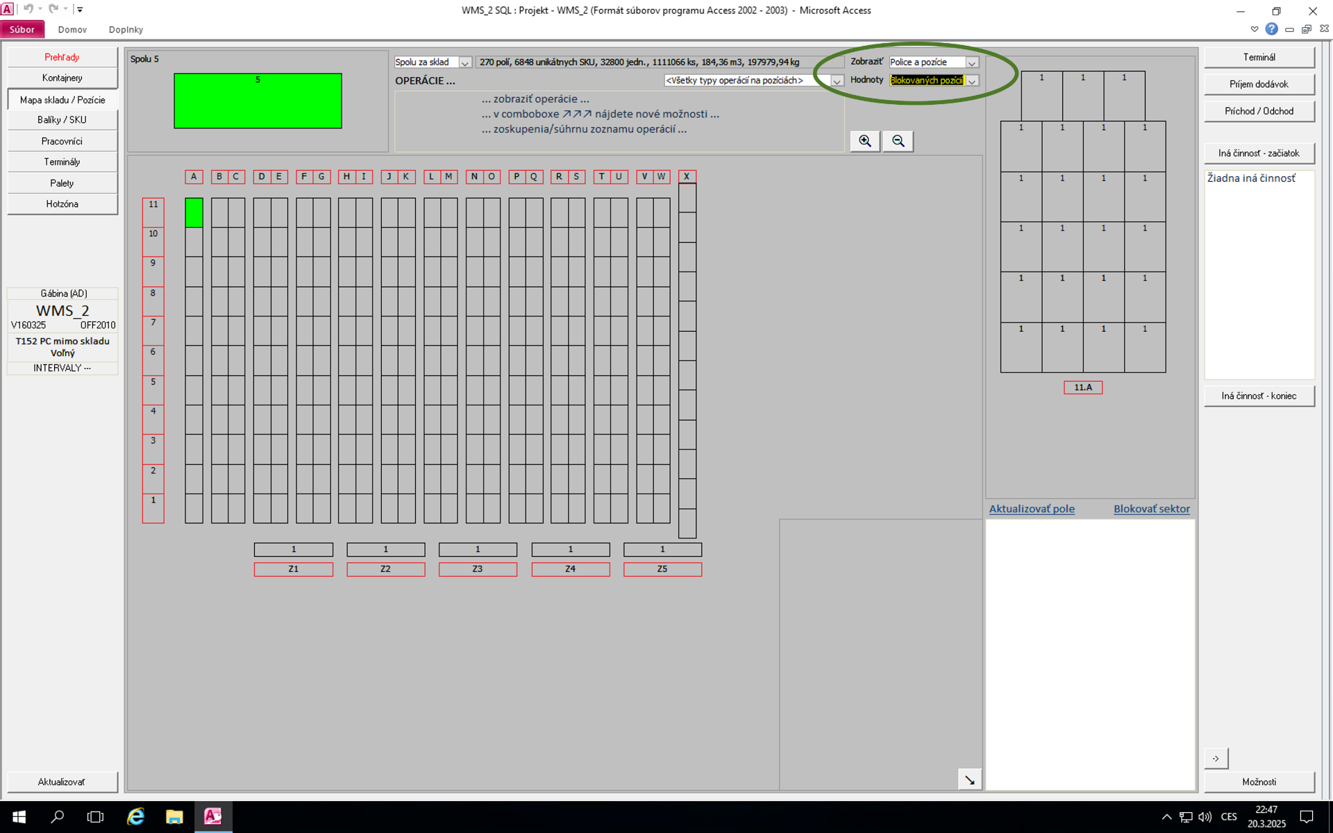 Pozice, které nejsou určeny k zaskladnění zboží, se označí v plánku "mapa skladu/pozice.Horní filtr musí být nastaven na "blokovaných pozícií" viz obrázek